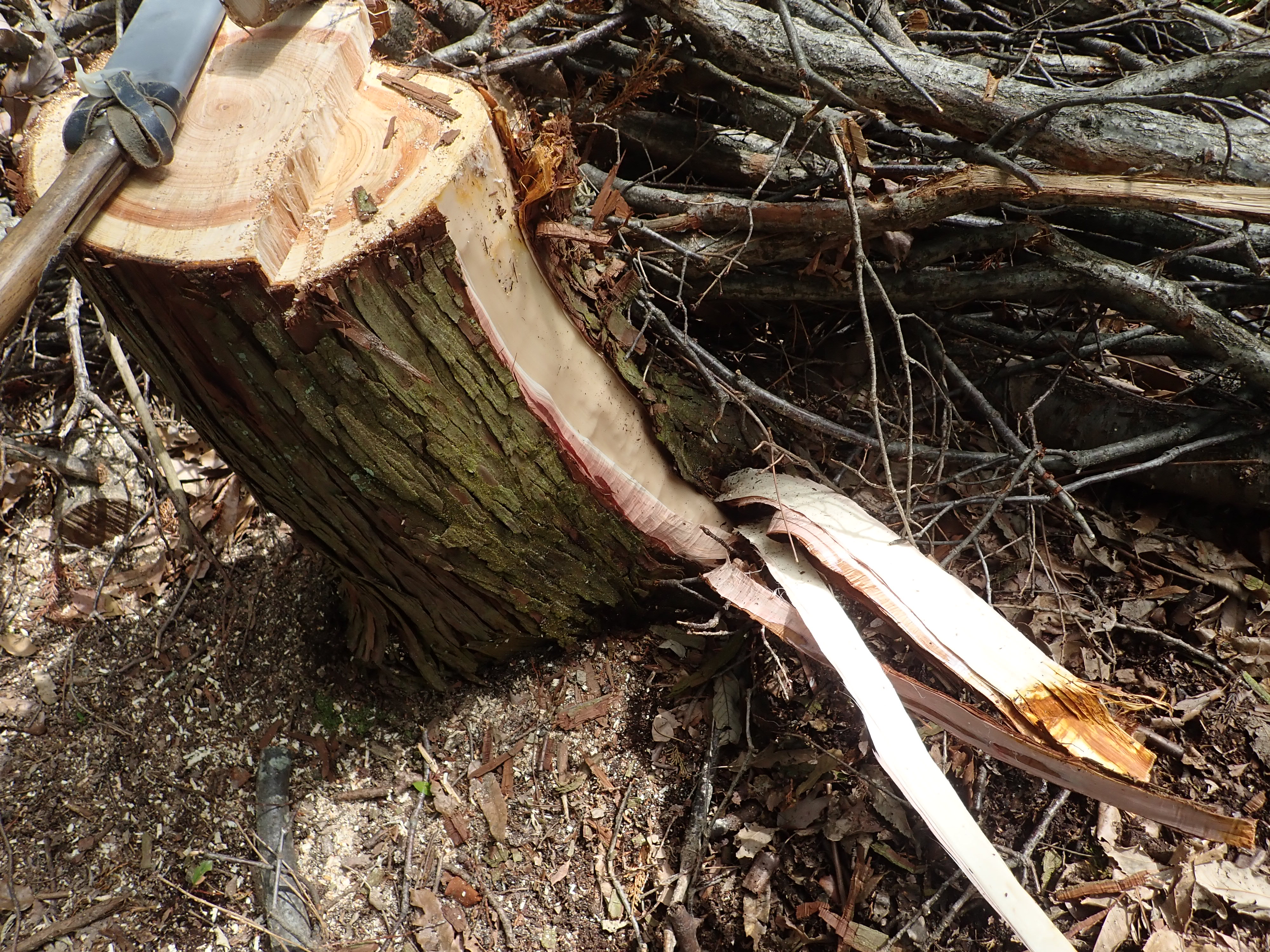 伐り株で試してみると・・・、気持ちよく一気に剥けます\(^o^)/小3のみなさん、楽しんでね~^^