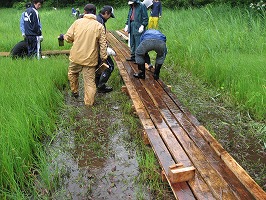 地権者の理解と小学校エコクラブのその保護者の協力や 大学生のオープンキャンパスでの参加もありました。 会員以上に多くの協力者のお陰を持ちまして 木道の整備や看板の設置を行う事ができました。